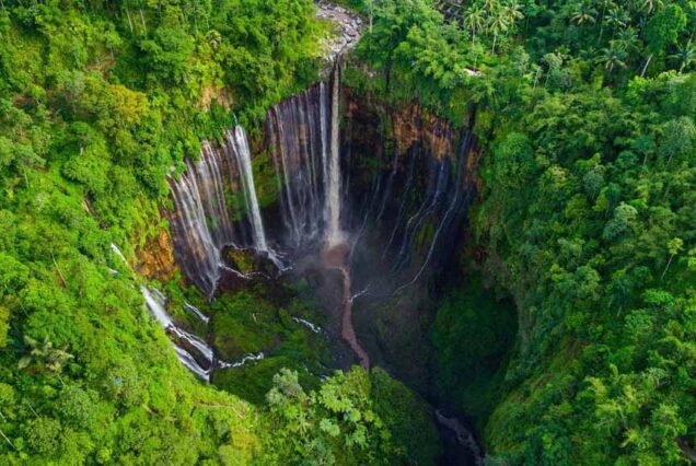 Tumpak Sewu, often praised as Java’s most beautiful waterfall, features a dramatic 120-meter cascade that resembles a widened curtain. Fed by Mount Semeru—the highest volcano in Java—its powerful flow plunges into a lush ravine at 50 meters above sea level. Locally known as Coban Sewu, this natural wonder lies on the border of Lumajang and Malang, offering breathtaking views from above.